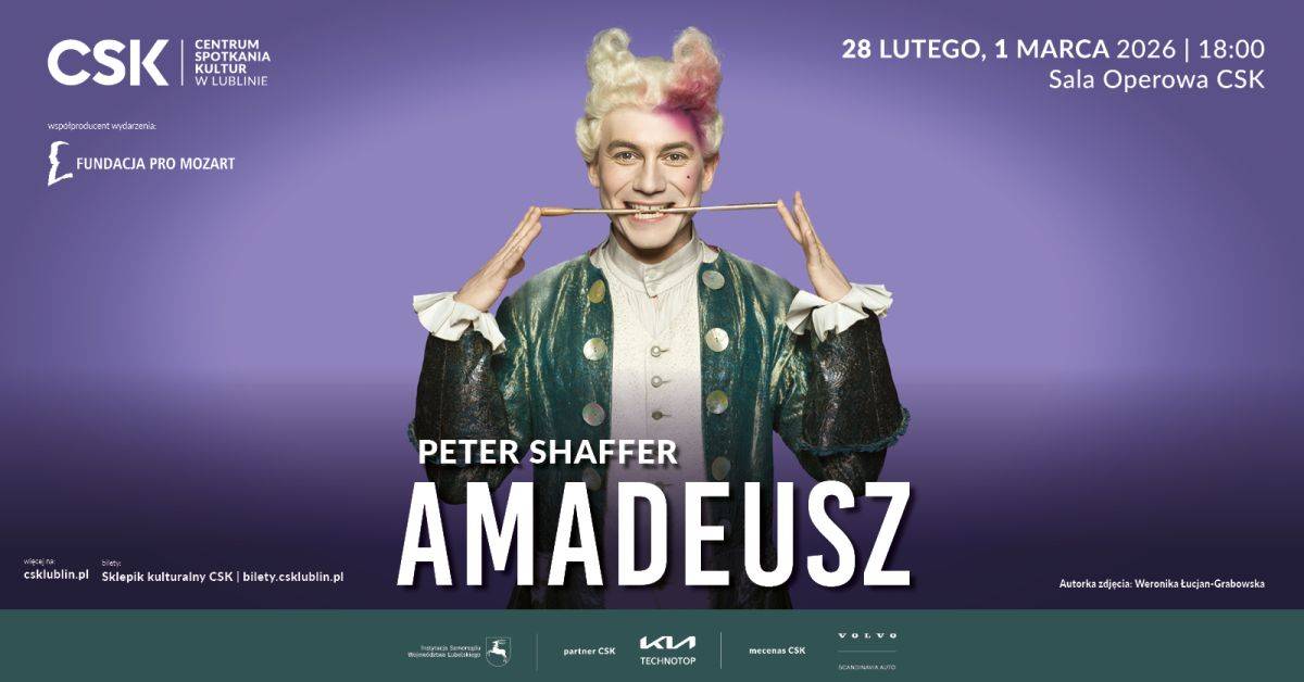 Spektakl "Amadeusz" Petera Shaffera to monumentalna opowieść o rywalizacji, zazdrości i genialności, w której muzyka Mozarta staje się osią dramatycznego konfliktu. Polska inscenizacja w reżyserii Anny Wieczur zachwyca rozmachem, udziałem orkiestry i chóru oraz wybitną obsadą aktorską, tworząc widowisko pełne emocji i intelektualnej głębi. Historia relacji Wolfganga Amadeusza Mozarta i Antonio Salieriego, osadzona w epoce oświecenia, pozostaje zaskakująco aktualna i poruszająca. Spektakl zostanie zaprezentowany 28 lutego i 1 marca 2026 roku o godz. 18.00 w Sali Operowej Centrum Spotkania Kultur w Lublinie; wydarzenie jest biletowane.